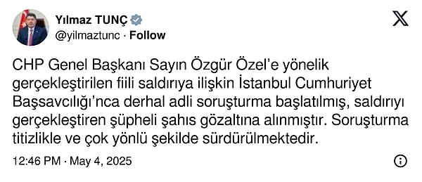 “CHP Genel Lideri Sayın Özgür Özel’e yönelik gerçekleştirilen fiili hücuma ait İstanbul Cumhuriyet Başsavcılığı’nca derhal isimli soruşturma başlatılmış, saldırıyı gerçekleştiren kuşkulu şahıs gözaltına alınmıştır. Soruşturma titizlikle ve çok taraflı formda sürdürülmektedir.