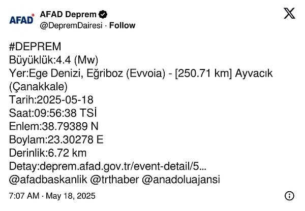 AFAD’ın son paylaşımına nazaran, Çanakkale’nin Ayvacık ilçesi açıklarında sabah saatlerinde 4.4 büyüklüğünde sarsıntı meydana geldi.