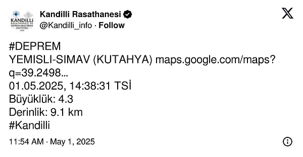 Kandilli Rasathanesi ise sarsıntının büyüklüğünü 4.3 olarak paylaştı. 👇