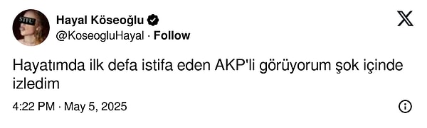 Oyuncu Hayal Köseoğlu, Ekrem Baki’nin istifa açıklamasını paylaşarak, “Hayatımda birinci kez istifa eden AKP’li görüyorum. Şok içinde izledim” yorumunda bulundu.