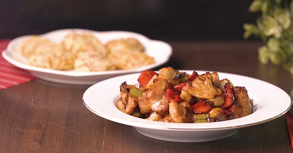 1. Tavukları ve zerzevatları doğrayın. Sos için gerekli gereçleri karıştırın. Tavukları sos ile kaplayın. Sebzeler ve tavukları hazneye yerleştirin. Tavuk ayarında pişirin.