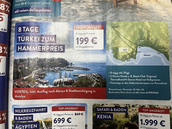 Almanya süpermarketinden 199 euroya Antalya tatili. Kelam konusu tatil ilanı Aldi’nin broşürlerinde yer aldı.