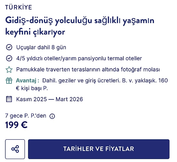Aldi’nin internet sitesinde çeşidin ayrıntılarına yer verildi. “Rakipsiz fiyat” tabirlerini yer aldığı ilanda “Antik yerleri, harika kıyı görüntülerini ve UNESCO Dünya Mirası Alanı olan Pamukkale’yi keşfedin. Yarım pansiyonlu birinci sınıf 4/5 yıldızlı otellerde rahatlayın ve termal bir otelde sağlıklı ömür anlarının tadını çıkarın – çeşitlilik, kültür ve rahatlama dolu bir tatil” denildi.
