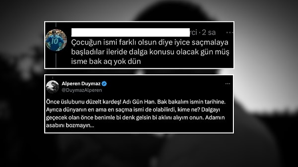 Bir takipçi, paylaşımın altına “Çocuğun ismi farklı olsun diye düzgünce saçmalamaya başladılar. İleride dalga konusu olacak. Gün müş. İsme bak. Yok dün.” formunda bir yorum bıraktı. Bu yorum karşısında hudutlarına hakim olamayan Alperen Duymaz, resmen had bildirdi: