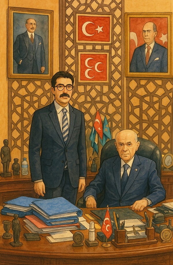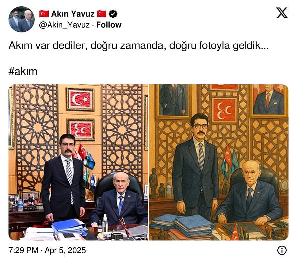 MHP Genel Lider Özel Kalem Müdür Yardımcısı Akın Yavuz, Bahçeli ile fotoğrafını anime usulüne çevirerek Instagram ve X (Twitter) hesabından paylaştı.