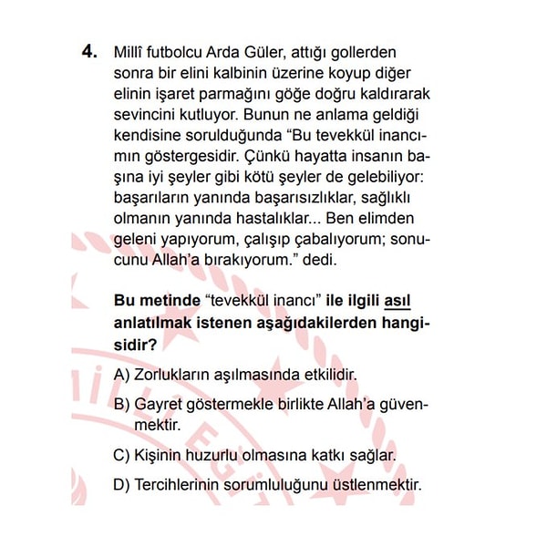 Soruda Arda Güler’in gol sevinci anlatıldı ve Arda Güler’in yaptığı, “Bu tevekkül inancımın göstergesidir” açıklaması hatırlatıldı.