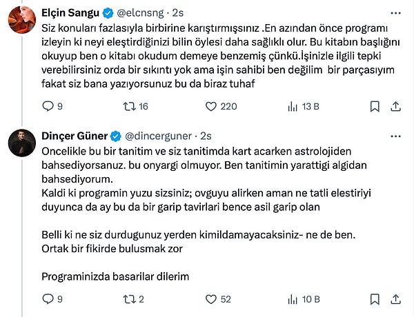 Astrolog Dinçer Güner ise Elçin Sangu’nun karşılığına karşılık, “Programın yüzü sizsiniz, lakin bu tanıtımda yapılan yanılgı algı yaratıyor,” diyerek tenkitlerini sürdürdü.