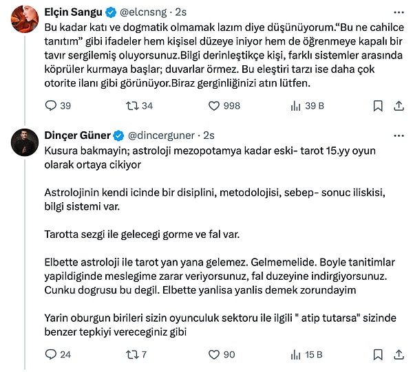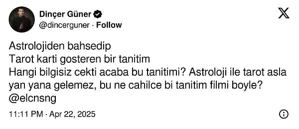 Elçin Sangu’nun yeni programının tanıtımına Astrolog Dinçer Güner’in yorumu ve tarot kartlarıyla yapılan tanıtıma reaksiyon göstermesi X’in gündemine kısa müddette oturdu. Elçin Sangu yapılan yorumların akabinde verdiği yanıtlarla mevzu bir oldukça uzadı.