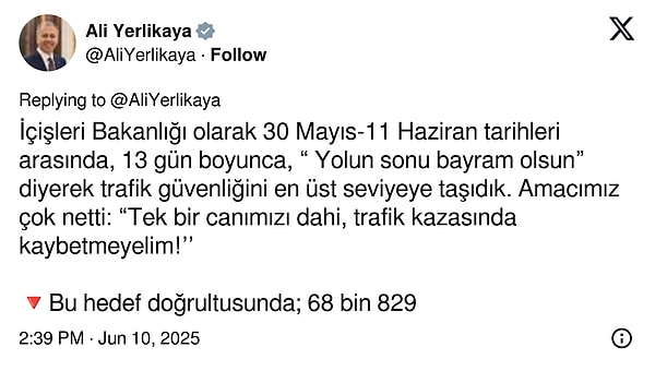 “İçişleri Bakanlığı olarak 30 Mayıs-11 Haziran tarihleri ortasında, 13 gün boyunca, “ Yolun sonu bayram olsun” diyerek trafik güvenliğini en üst düzeye taşıdık. Hedefimiz çok netti: “Tek bir canımızı dahi, trafik kazasında kaybetmeyelim!’’