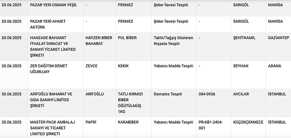 Adana’da Zer Dağıtım’ın kekiğinde yabancı husus, İstanbul’da faaliyet gösteren Arifoğlu Baharatı’nın tatlı kırmızı biberinde domates, Manisa’nın Pazar Yeri markasının pekmezinde, şeker eği ortaya çıktı.