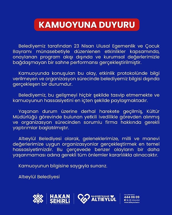 Belediye dansın program dışında yer aldığını, belediyenin ilgili çalışanın misyondan alındığını ve tertip şirketi ile ilgili gerekli yaptırımların yapıldığını açıkladı.