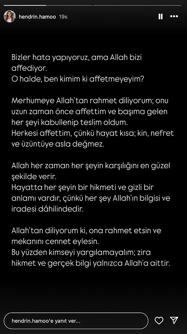‘Bizler yanılgı yapıyoruz, fakat Allah bizi affediyor. O halde, ben kimim ki affetmeyeyim? Merhumeye Allah’tan rahmet diliyorum; onu uzun vakit evvel affettim ve başıma gelen her şeyi kabullenip teslim oldum. Herkesi affettim, zira hayat kısa; kin, nefret ve kedere asla değmez. Allah her vakit her şeyin karşılığını en hoş formda verir. Hayatta her şeyin bir hikmeti ve bâtın bir manası vardır, zira her şey Allah’ın bilgisi ve iradesi dâhilindedir. Allah’tan diliyorum ki, ona rahmet etsin ve yerini cennet eylesin. Bu yüzden kimseyi yargılamayalım; çünkü hikmet ve gerçek bilgi sırf Allah’a aittir.’ açıklamasında bulundu.