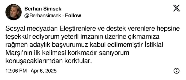 Şimşek, daha sonra yaptığı paylaşımda ise “Sosyal medyadan Eleştirenlere ve dayanak verenlere hepsine teşekkür ediyorum kâfi imzanın üzerine çıkmamıza karşın adaylık müracaatımız kabul edilmemiştir İstiklal Marşı’nın birinci sözü korkmadır sanıyorum konuşacaklarımdan korktular” tabirlerini kullandı.