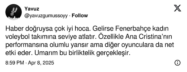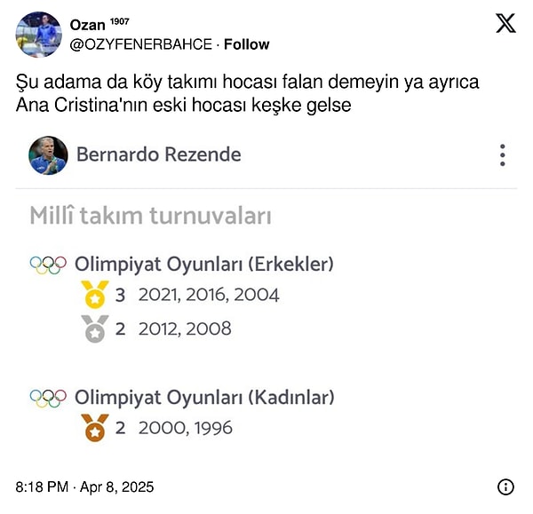 Gelecek dönem şampiyonluk amaçlarına ulaşmak isteyen Fenerbahçe Bayan Voleybol Grubu’nun yeni başantrenörünün Brezilya Erkek Mili Grubu ile önemli muvaffakiyetler elde eden Bernardo Rezende olacağı voleybol dünyasının gündemine oturdu. Pekala muhtemel transfer için taraftarlar ne diyor?