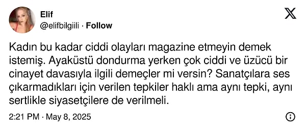 “Olayı buralara çekmenin hem davaya hem de toplumsal olarak yüzleşmemiz gereken gerçeklere ziyan verdiğini ve bu formda olayın ciddiyetinin hafiflediğini düşünüyorum.”