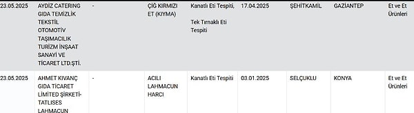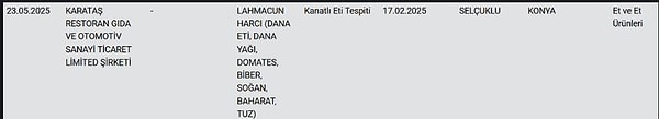 Listede lahmacunda kullanılması gereken dana eti yerine ‘kanatlı eti’ ve ‘tek tırnaklı eti’ kullanıldığı tespit edildi.