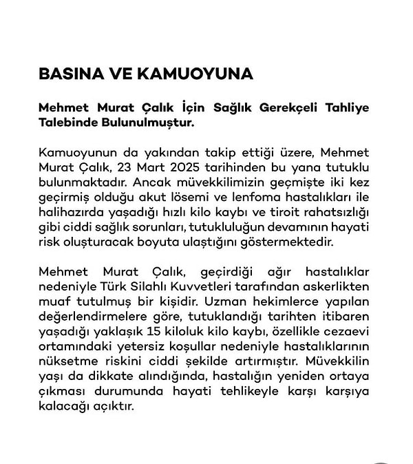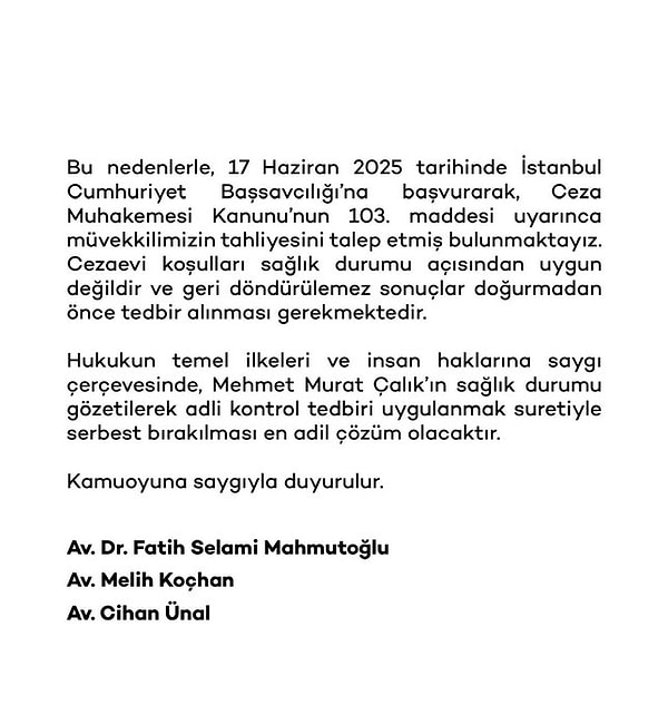 Başkan Mehmet Murat Çalık’ın avukatı Melih Koçhan, müvekkilinin sıhhat meselelerinin berbata gittiği gerekçesiyle tahliye talebinde bulunduklarını açıkladı.