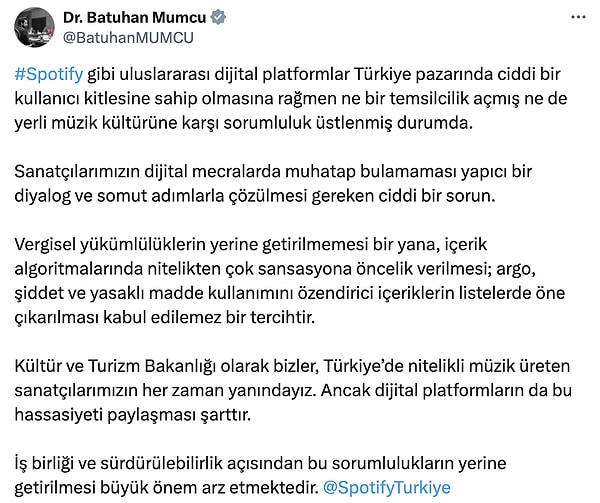 Kültür ve Turizm Bakan Yardımcısı Dr. Batuhan Mumcu, Spotify’ın Türkiye’de hala bir temsilcilik açmamasına yönelik reaksiyon gösterip nitelikli müzik üreten sanatkarların yanında olduklarını açıkladı.