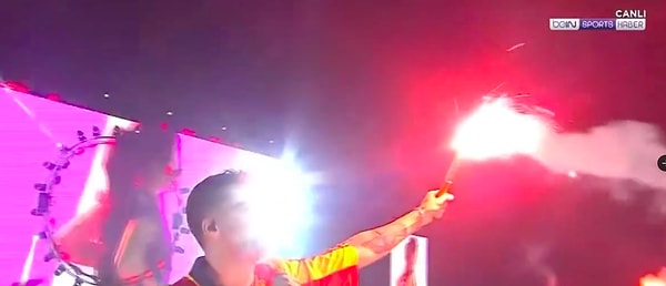 Emir Can İğrek sahneye Galaasaray’ın efsane UEFA Kupası dönemindeki Galatasaray formasıyla çıktı. Taraftardan büyük alkış alan İğrek müziğini da meşalelerle söyledi.