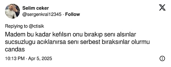 Candaş Tolga Işık, “Onu bırakıp seni alsınlar” diyen bir kullanıcıya da karşılık verdi.