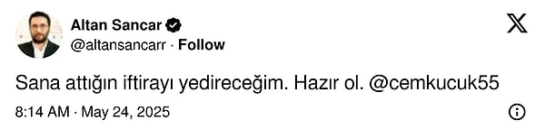 ‘Sana attığın iftirayı yedireceğim. Hazır ol’ kelamlarıyla Cem Küçük’ü etiketleyen Altan Sancar, ‘Alışmışsın parasını almadığın kelamı edememeye. Herkesi kendin üzere sanıyorsun. Ben seni bu kadar korkuttuysam ne memnun. Lakin asıl artık başlıyorum’ dedi ve şöyle devam etti: