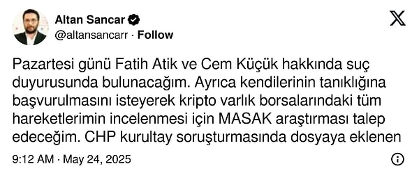 ‘Pazartesi günü Fatih Atik ve Cem Küçük hakkında cürüm duyurusunda bulunacağım. Ayrıyeten kendilerinin tanıklığına başvurulmasını isteyerek kripto varlık borsalarındaki tüm hareketlerimin incelenmesi için MASAK araştırması talep edeceğim. CHP kurultay soruşturmasında belgeye eklenen MASAK raporunun da evraka eklenmesini isteyeceğim. Haydi bakalım, kimin saklayacak neyi varmış görelim.’