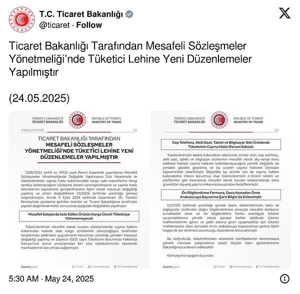 Söz konusu düzenlemelere yönelik Ticaret Bakanlığı bir açıklama yayımladı. Açıklamada “Mesafeli satışlarda iade edilen eserin kargo fiyatı tüketiciye yüklenmeyecek” denilerek şöyle devam edildi: