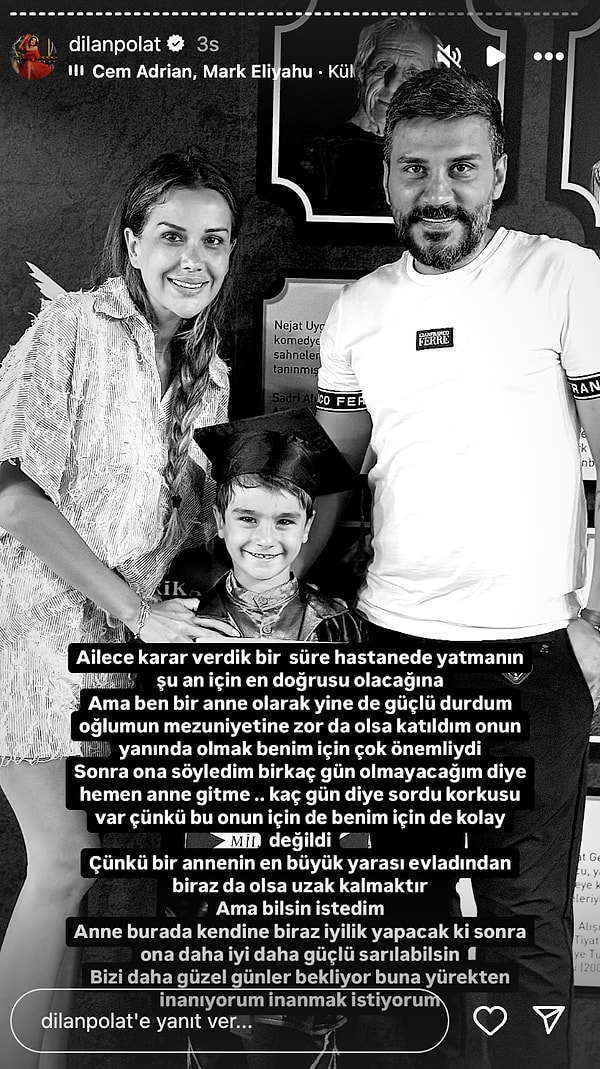Hastanede kaldığı mühlet boyunca toplumsal medya hesabını etkin kullanmaya devam eden Dilan Polat, oğlunun mezuniyetine katıldığını lakin çabucak akabinde tedavi sürecine başladığını lisana getirdi.