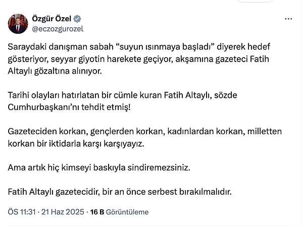 Özgür Özel toplumsal medya hesabından ‘Fatih Altaylı gazetecidir’ diyerek özgür bırakılması tarafında davet yaptı.