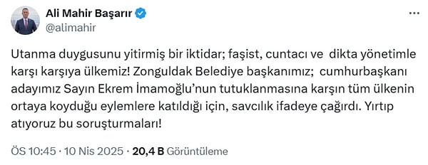 ‘Utanma hissini yitirmiş bir iktidar; faşist, cuntacı ve dikta idareyle karşı karşıya ülkemiz! Zonguldak Belediye liderimiz; cumhurbaşkanı adayımız Sayın Ekrem İmamoğlu’nun tutuklanmasına rağmen tüm ülkenin ortaya koyduğu aksiyonlara katıldığı için, savcılık tabire çağırdı. Yırtıp atıyoruz bu soruşturmaları’ diye yazdı.