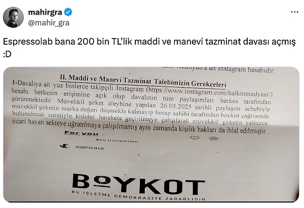 Ekrem İmamoğlu’nun diploma iptali ve sonrasına tutuklanmasıyla başlayan süreçte CHP’nin boykot listesine aldığı markaların başında gelen Espressolab, boykot daveti yaptığını argüman ettiği şahıslar hakkında tazminat davası açmaya başladı. Bir toplumsal medya kullanıcısı dava tebligatını paylaşarak “Espressolab bana 200 bin TL’lik maddi ve manevi tazminat davası açmış :D” tabirlerini kullandı.