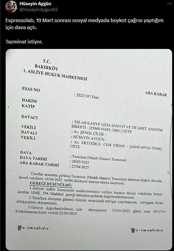 Eski CHP Milletvekili Hüseyin Aygün de boykota dayanak vererek paylaşım yaptı.Aygün’ün paylaşımı Espressolab’in talebiyle erişime engellendi. Boykot listesinde yer alan Espressolab, Aygün’e bir de tazminat davası açtı. Hüseyin Aygün açılan tazminat davasını “Espressolab, 19 Mart sonrası toplumsal medyada boykot daveti yaptığım için dava açtı. Tazminat istiyor” diyerek duyurdu.