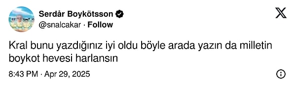 ‘Kral bunu yazdığınız düzgün oldu bu türlü ortada yazın da milletin boykot hevesi harlansın.’