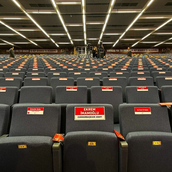 “Cumhurbaşkanı Adayı Ekrem İmamoğlu” yazan koltuk, Özgür Özel için ayrılan koltuğun yanında yer aldı.