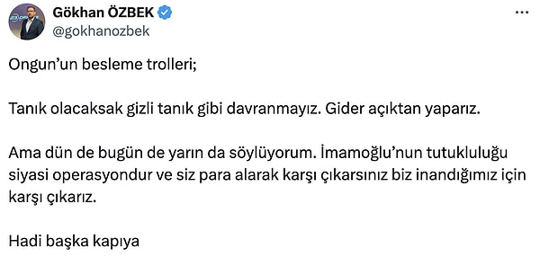‘Ongun’un besleme trolleri; Şahit olacaksak zımnî şahit üzere davranmayız. Sarfiyat açıktan yaparız. Lakin dün de bugün de yarın da söylüyorum. İmamoğlu’nun tutukluluğu siyasi operasyondur ve siz para alarak karşı çıkarsınız biz inandığımız için karşı çıkarız. Haydi öbür kapıya’ sözlerini kullandı.