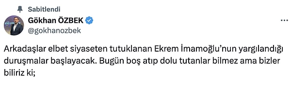 Özbek’in Ekrem İmamoğlu’nun tutuklandığı tarih olan 23 Mart’ı iki ay öncesinden işaret etmesi kuşku uyandırmıştı.
