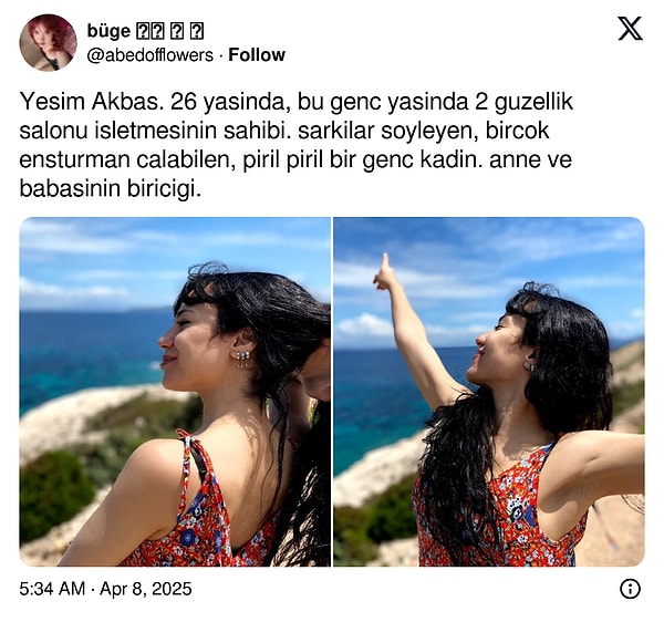 “abedofflowers” isimli X kullanıcısı, 2023 yılında hayatını kaybeden Yeşim Akbaş cinayetini paylaştı.