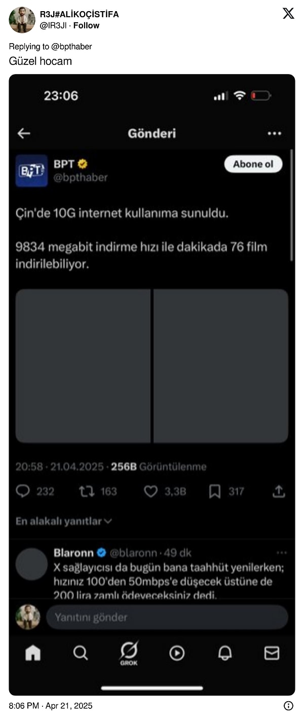 Dünya 5G’yi tartışırken Türkiye’de internet suratı, gerek fiyatları gerek sunduğu süratle tüketicinin en çok şikayet ettiği hususlardan. Bu durum datalara de yansımış durumda. Hatta sabit internet indirme suratında 42,90 Mbps ortalamasıyla 106’ncı, taşınabilir internet indirme suratında 46,37 Mbps ortalamasıyla 58’inci sırada. Bu da ülkemizi Afrika ülkeleriyle misal bir hizmet düzeyine çekiyor. Hal böyleyken Çin’de 10G internete geçilmesi ülkemizde ironik reaksiyonları beraberinde getirdi.