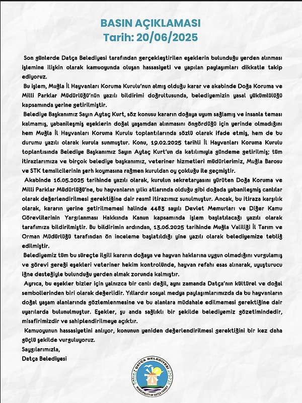‘Son günlerde Datça Belediyesi tarafından gerçekleştirilen eşeklerin bulunduğu yerden alınması sürecine ait olarak kamuoyunda oluşan hassasiyeti ve yapılan paylaşımları dikkatle takip ediyoruz.Bu süreç, Muğla İl Hayvanları Koruma Kurulu’nun almış olduğu karar ve ardından Tabiat Muhafaza ve Ulusal Parklar Müdürlüğü’nün yazılı bildirimi doğrultusunda, belediyemizin yasal yükümlülüğü kapsamında yerine getirilmiştir.