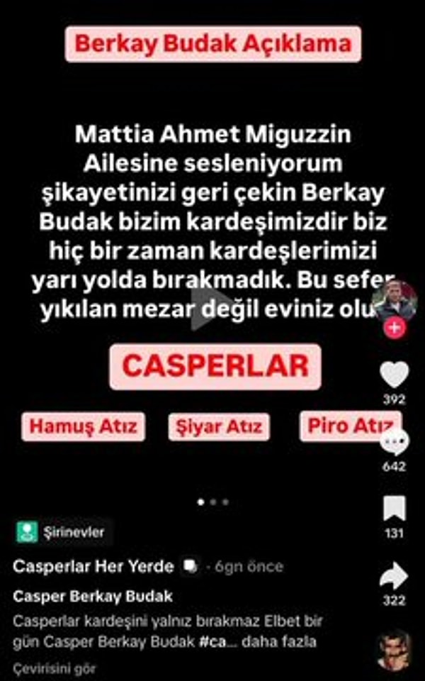 Suç örgütü ‘Mattia Ahmet Minguzzi ailesine sesleniyorum’ dedikleri açıklamada ‘Şİkayetinizi geri çekni. Berkay Budak bizim kardeşimiz. Biz hiçbir vakit kardeşlerimizi yarı yolda bırakmadık. Bu sefer yıkılan mezar değil, konutunuz olur.’ifadelerine yer verdi
