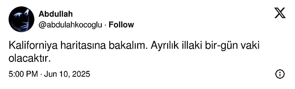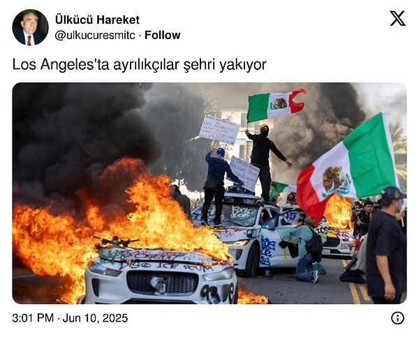Kaliforniya’da tansiyon saatler içinde tepeye çıktı. Göçmen operasyonlarıyla başlayan tansiyon federal hükümetin askeri müdahalesi ve eyalet idaresinin direnişiyle tam manasıyla siyasi bir krize dönüştü. Devlet Bahçeli’nin 2017 yılında attığı tweet, bu olayın akabinde gündem oldu. Tweette ‘Mesela Kaliforniya’nın içten içe büyüyen, devamlı taban tutan ayrılma talepleri uygunca somutlaşır, gün yüzüne çıkarsa ABD ne yapacaktır?’ sözlerine yer veren Bahçeli’nin bu olayları yıllar evvelden iddia etmesine yorumlar gecikmedi.