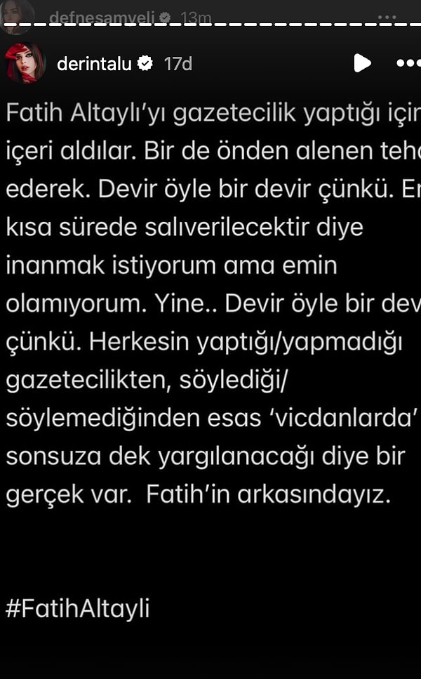 Gazeteci ve televizyoncu Fatih Altaylı, 20 Haziran Cuma günü YouTube kanalında yayınladığı son görüntüdeki açıklamaları nedeniyle gözaltına alındı. Magazinin tanınan ismi Defne Samyeli ve kızı Derin Talu’dan Altaylı’ya takviye geldi.
