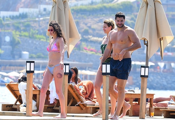 Ünlü oyuncu, arkadaşlarıyla birlikte Yalıkavak’ta bir otelin iskelesinde güneşlenirken objektiflere yakalandı.