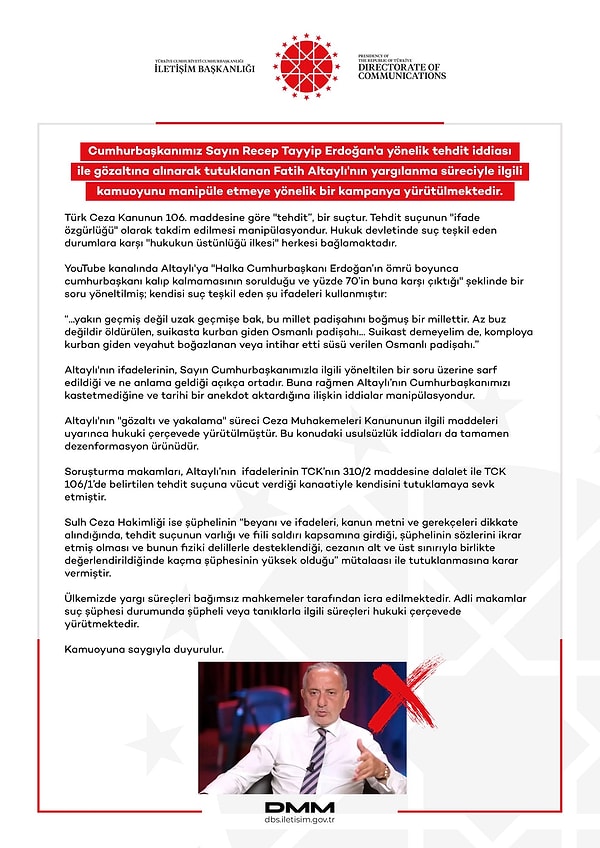 Dezenformasyonla Gayret Merkezi (DMM), Fatih Altaylı’nın tutuklanmasıyla ilgili kamuoyunda yayılan savlara ait açıklama yaptı. Açıklamada, Altaylı’nın tabirlerinin tehdit kapsamında kıymetlendirilebileceği ve tüzel sürecin mevzuata uygun formda yürütüldüğü belirtildi.