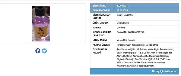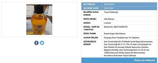 Listede yer alan eserlerden bir tanesi L’actone marka odası kokusu oldu. ‘Sweet Sugar Oda Kokusu’ eser güvensizlik nedeniyle piyasadan toplatılıyor. Eserin taşıdığı riskler ‘Kesikler, Kimyasal, Sıhhat Riski (Diğer)’ olarak sıralandı.
