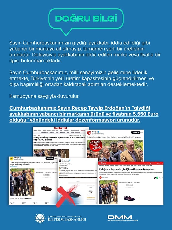 Dezenformasyonla Çaba Merkezi (DMM) Cumhurbaşkanı Erdoğan’ın ayakkabısının ismi geçen markadan olmadığını ve fiyatının da tez edildiği üzere 5 bin 550 euro olmadığını açıkladı.