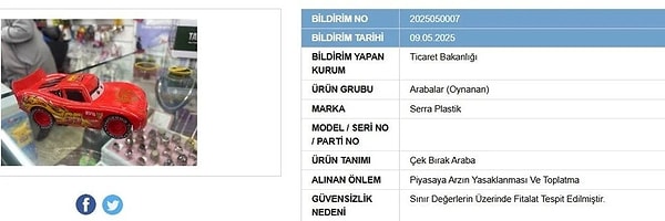 Ticaret Bakanlığı, iki adet ürünü ifşa etti. Yapılan kontrollerde usulsüzlük tespit edilen oyuncak otomobil ile oda kokusu hakkında karar verildi. İki eserin satışı yasaklandı ve piyasadan toplatılmasına karar verildi.