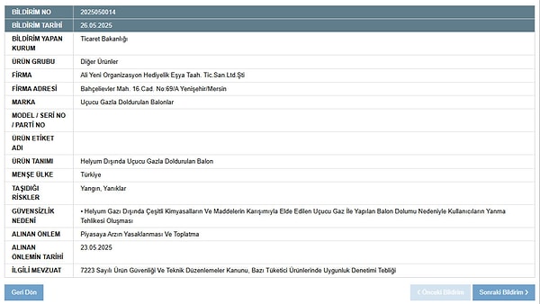 Bu kere de bolanlar hakkında bir karar alındı. Güvensiz Eser Bilgi Sistemi (GÜBİS) üzerinden yapılan bildirimde, Mersin’de faaliyet gösteren bir firmaya ilişkin uçucu gazla doldurulan balonların kullanıcı sıhhatini tehdit ettiği tespit edildi.