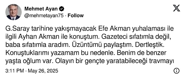 ‘G.Saray tarihine yakışmayacak Efe Akman yuhalaması ile ilgili Ayhan Akman ile konuştum. Gazeteci sıfatımla değil, baba sıfatımla aradım. Kederimi paylaştım. Dertleştik. Konuştuklarımı yazamam bu nedenle. Benim de misal yaşta oğlum var. Olayın bir gençte yaratabileceği travmayı anlayabilecek olsa o ahmaklar… Sizin evladınızın başına gelse ne hissedecekseniz, Ayhan onu hissediyor. Kulüp tarihine kara lekedir bu olay. İnsan, ebeveyn olduğunu unutmayanlar için tabii!’