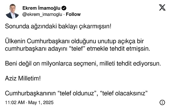 Silivri Cezaevi’nde tutuklu bulunan Ekrem İmamoğlu toplumsal medyadan yaptığı paylaşımla Cumhurbaşkanı Erdoğan’a karşılık verdi. “Sonunda ağzındaki baklayı çıkarmışsın” diyen İmamoğlu, “Cumhurbaşkanının ‘telef oldunuz’, ‘telef olacaksınız’ kelamı Türk siyasi tarihinin en dehşet verici itiraflarından birisidir.” sözlerini kullandı.